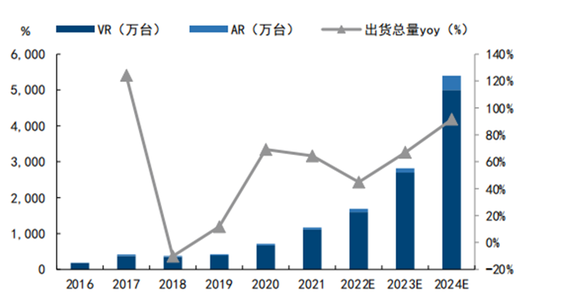 ▲2016-2024E年全球VR/AR头显出货量变化及预测