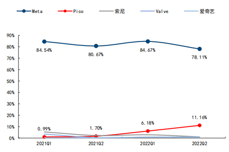 2)从全球市场看,22Q1-22Q2Pico在全球市场的市占率分别为6.18%和11.16%,分别同增72%、81%(不同口径导致和前文数值略有偏差),Meta全球占比略下滑或可和其提价有关,Pico是全球市场唯一市占率提升的品牌,索尼、Valve和爱奇艺均略有下滑。