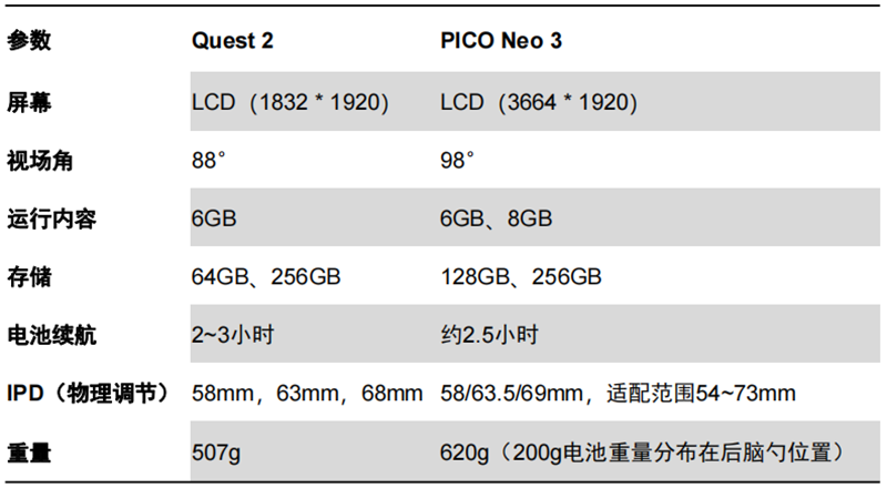 Pico新款硬件性能、技术实力足以和Quest媲美。以Pico Neo3为例,硬件参数指标略超Quest 2,在屏幕、视场角等方面优于Quest 2。