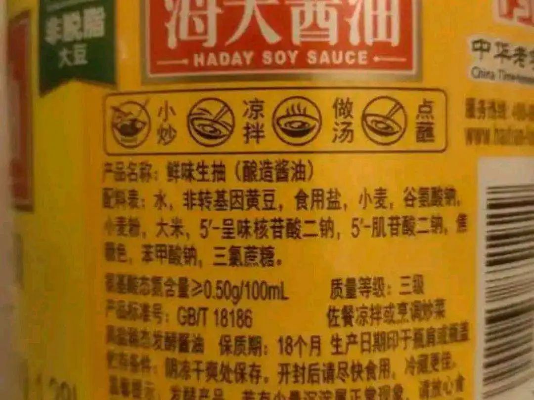 9月下旬,有网友质疑海天酱油疑似在国内和国外采用双重生产标准,并晒出了相关图片。其中,在日本销售的海天酱油仅有水、大豆、小麦等天然原料,以及食盐、砂糖等调味剂,而在国内销售的部分海天酱油产品,则多了焦糖色、苯甲酸钠、三氯蔗糖等添加剂。
