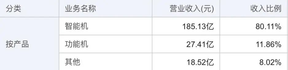 而今年上半年,传音的智能手机业务和功能机业务的营收分别为185.13亿元和27.41亿元,占总收入的80.11%和11.86%。
