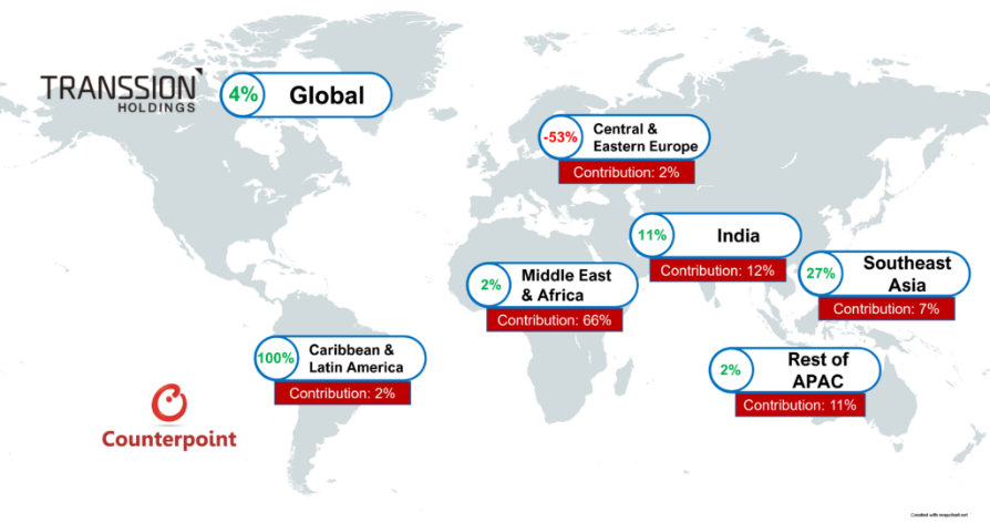 传音控股2022年Q2地区出货量分布,来源: Counterpoint Market Monitor Service