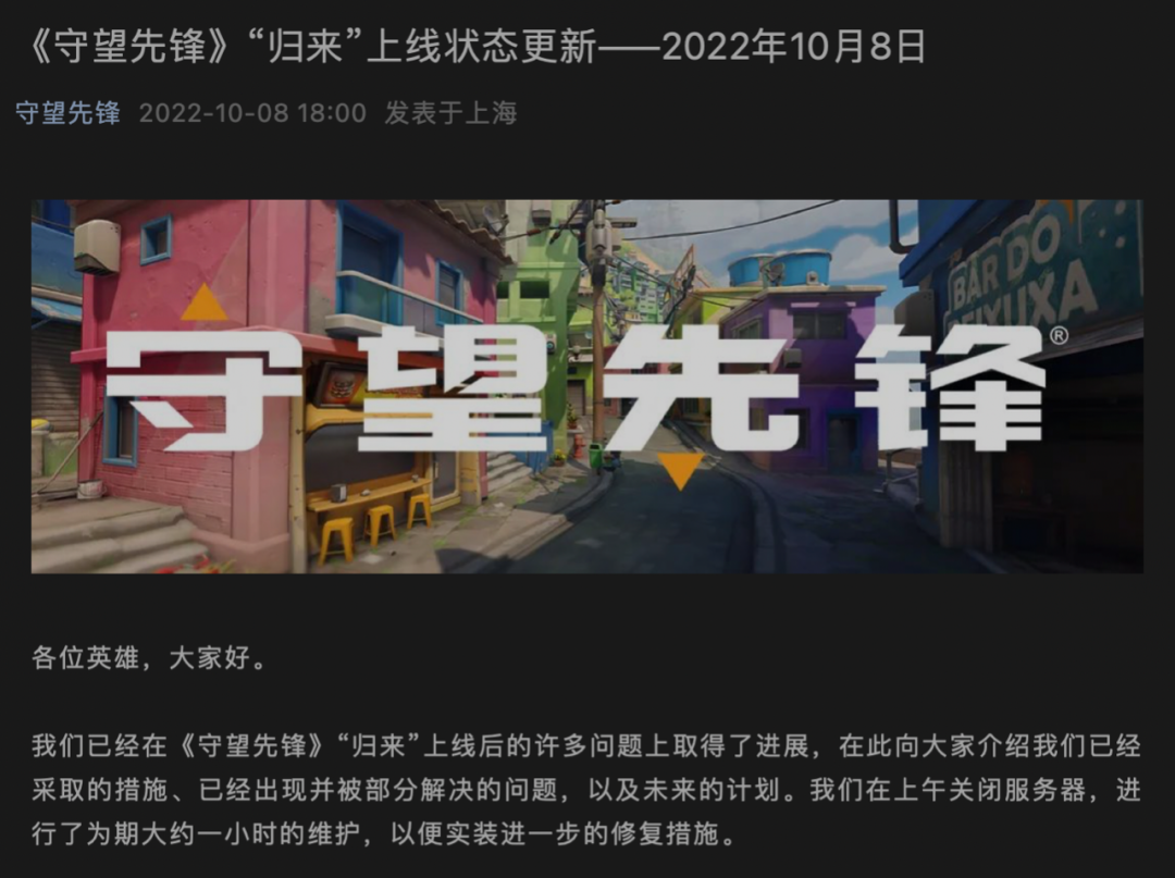 大约一周前,《守望先锋》官方微博宣布,“归来”预计于10月5日凌晨3点左右开启,为了保障新版本顺利上线,当前版本的游戏将于10月3日晚间关停。