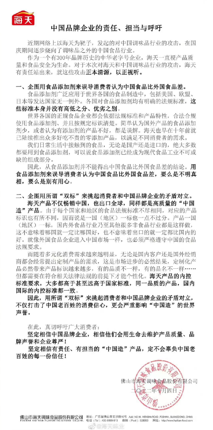9月30日晚间,海天味业在其官方微博发布了一则《严正声明》,首次公开对添加剂事件做出回应,称其所有产品都严格按照《食品安全法》生产,所有产品中食品添加剂的使用及其标识均符合我国相关标准法规要求。