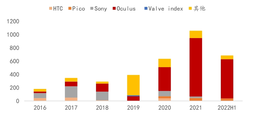 2016-2022H1 全球主要VR头显出货量分布,图源IDC、VR陀螺、国联证券