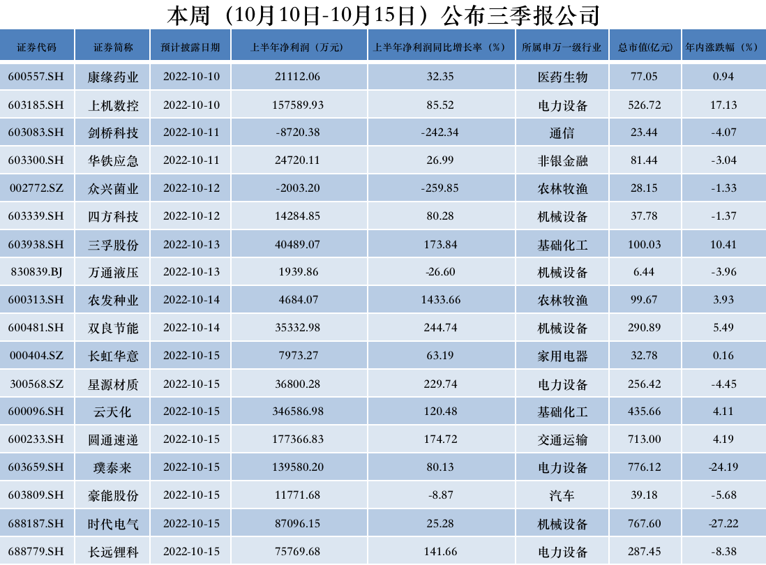 其余板块中,深主板首份三季报来自众兴菌业(002772.SZ),将于10月12日亮相;北交所万通液压(830839.BJ)的三季报将于10月13日亮相;科创板首批三季报将于10月15日披露,长远锂科(688779.SH)、时代电气(688187.SH)2家公司拔得头筹;创业板首份三季报来自星源材质(300568.SZ),也将于10月15日见分晓。