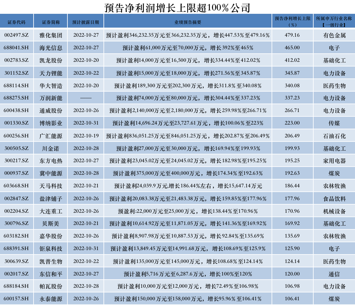 以净利润同比增长上限看,22家公司预计净利润翻倍式增长,其中,雅化集团(002497.SZ)、海光信息(688041.SH)、凯龙股份(002783.SZ)、天力锂能(301152.SZ)、华大智造(688114.SH)、万润新能(688275.SH)、通威股份(600438.SH)、博纳影业(001330.SZ)、广汇能源(600256.SH)9家公司预告净利润最高增长超2倍。