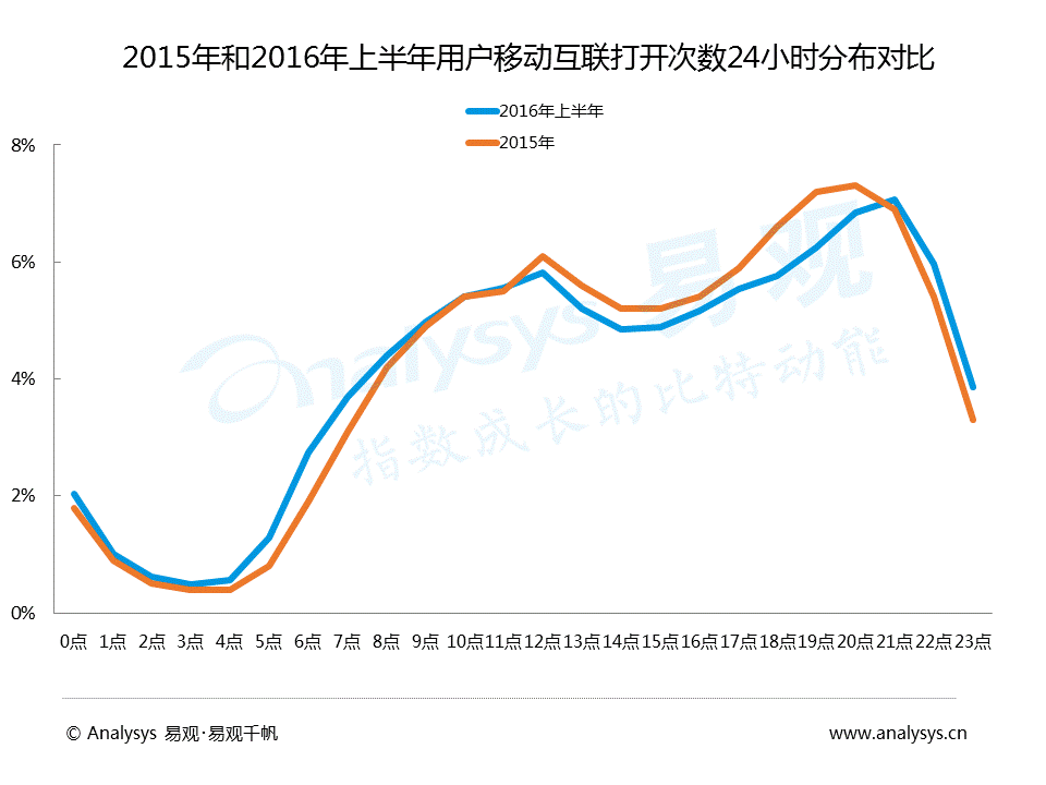 2015年的夜晚活跃峰值时间点为20点,2016年上半年活跃峰值时间点为21点,夜晚的活跃峰值后移,人们更倾向于晚睡,移动互联正悄悄改变人们的作息。