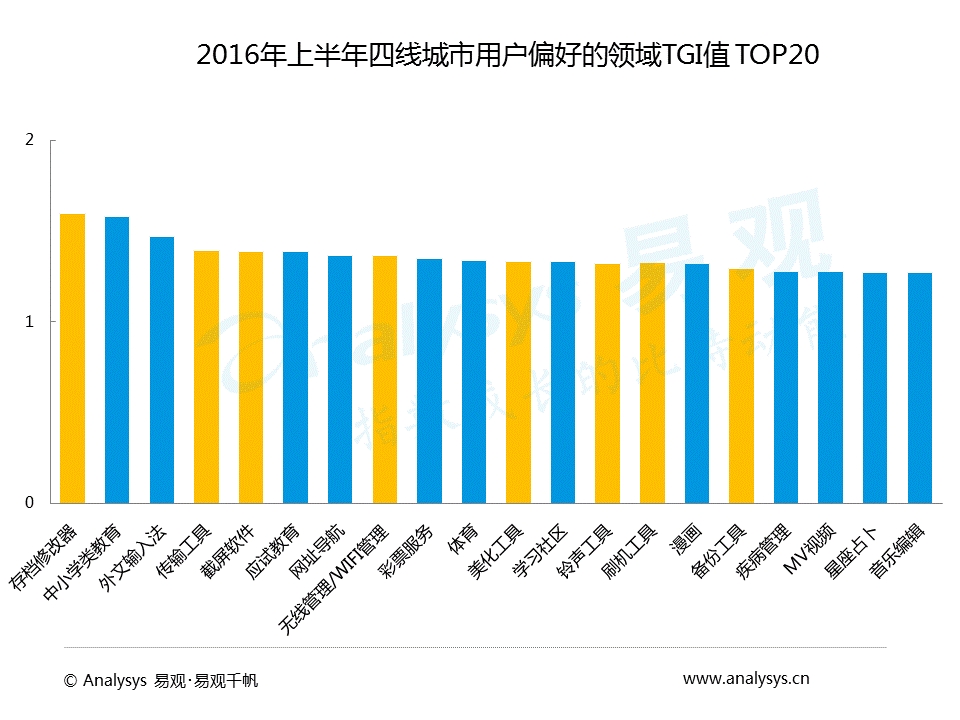四线城市用户偏好各类工具类应用,对移动互联网的使用更加谨慎,他们对教育也较为关注,在娱乐上比较偏好音乐。