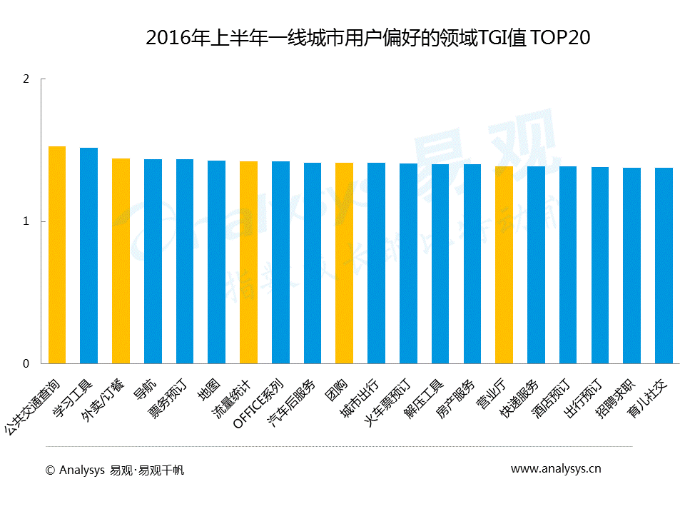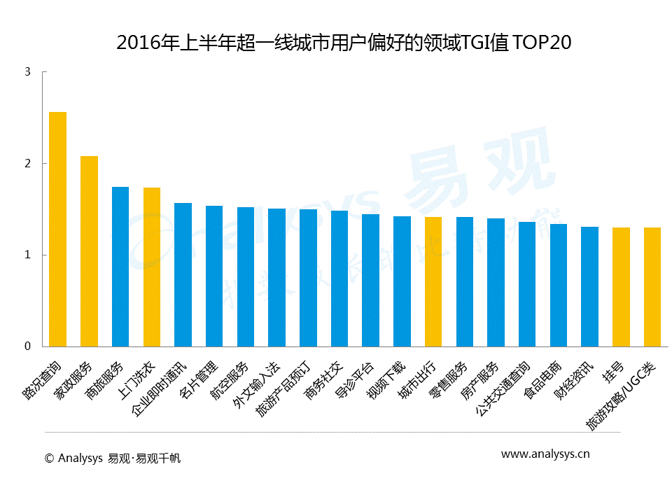超一线城市用户善于利用移动互联网提升日常生活的效率,偏好路况查询、家政服务、上门洗衣和挂号等应用;