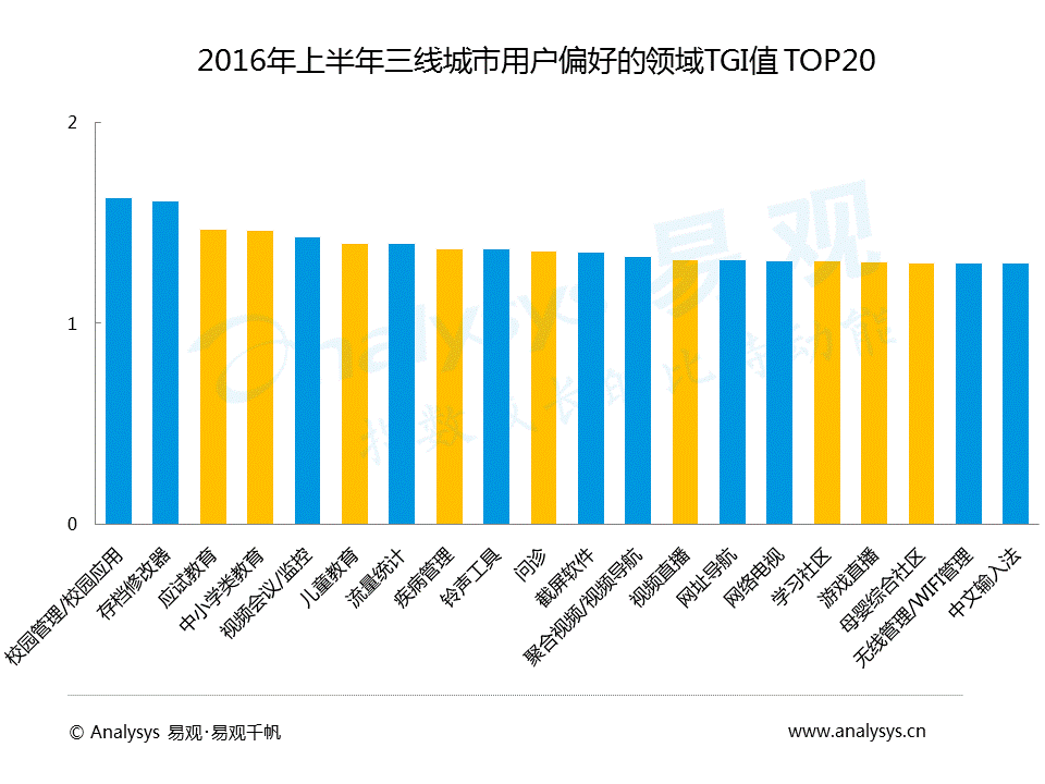 三线城市用户对移动互联的依赖上,更注重刚需,主要偏好教育和医疗类应用,娱乐类应用偏好直播类应用;