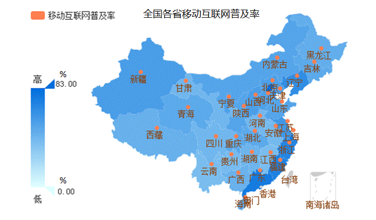 时隔17年,中国移动互联网经历了翻天覆地的发展,活跃用户将突破八亿,移动互联的普及率进一步提升,移动互联网已然根深于全国各地人民的日常生活。北上广的移动互联普及率均超过70%,总体来说,沿海一带的普及率高于内陆地区。