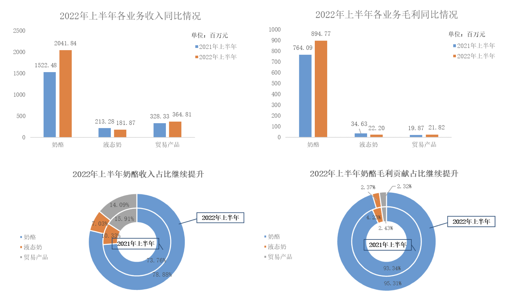 今年上半年,其营收和净利润分别增长了25.48%和18.03%,其中奶酪板块实现收入20.42亿元,较上年同期增长34.11%,奶酪业务规模持续扩大。这其中,家庭餐桌系列奶酪业务实现收入2.8亿元,同比增长94.3%,是增速最快的一个细分品类。