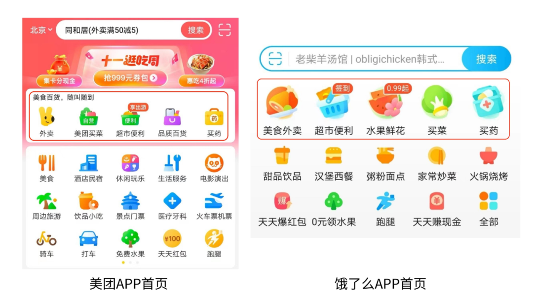 对比饿了么APP首页一级入口可以发现,与饿了么相比,美团置顶多出“品质百货”入口,其中涵盖美妆、母婴、数码等多品类产品。