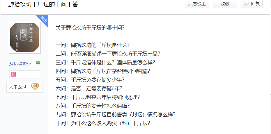 在关于千斤坛的十问十答中,肆拾玖坊这样解释:顾名思义,千斤坛就是盛装了1000斤美酒的坛。按照十问十答里的说明,茅台的千斤坛150万/坛起,国台的千斤坛也是50万/坛起,与同类产品比肆拾玖坊千斤坛性价比超高。因为肆拾玖坊的千斤坛一开始是10万/坛起,后来是16.8万/坛起。