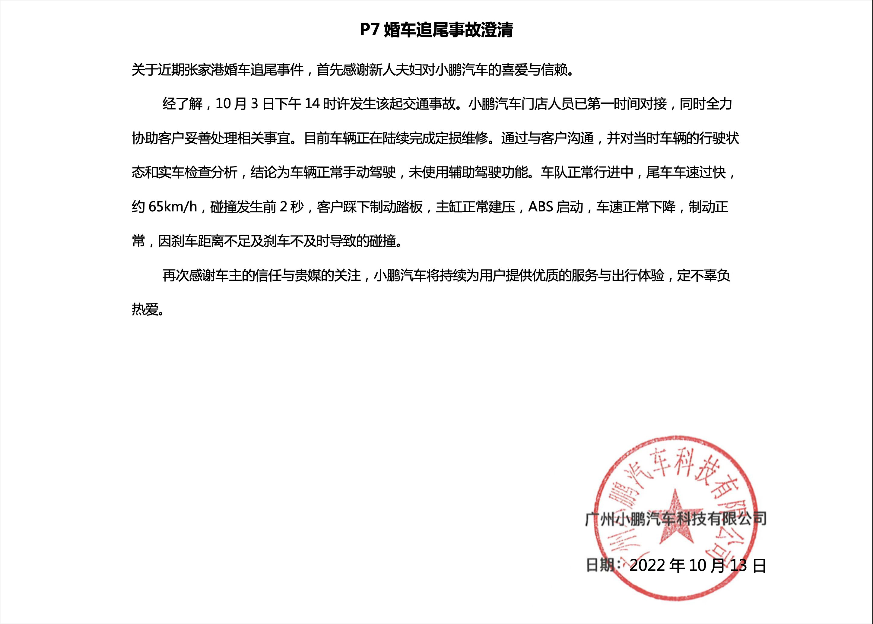 与此同时,在“十一”假期期间,小鹏P7婚车集体行驶途中,造成至少4辆P7追尾。对此小鹏回应,经与车主沟通,车辆处于手动驾驶模式,并未使用辅助驾驶功能。因刹车距离不足,造成追尾事故。