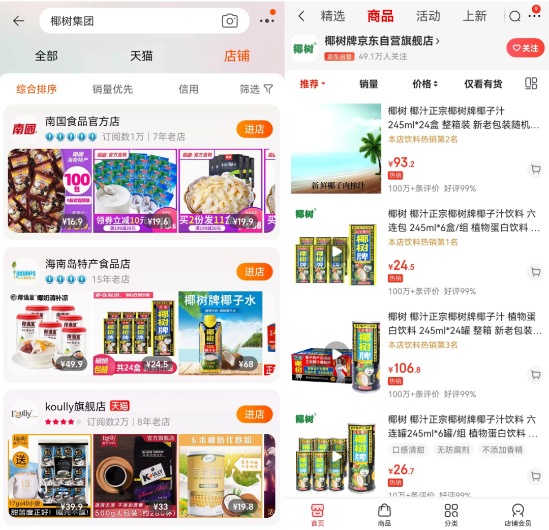 2021年,曾有椰树集团代理商对《时代周报》表示,目前椰树集团并无发展电商渠道,网上在售的椰树产品货源大多来自椰树各地分销商。