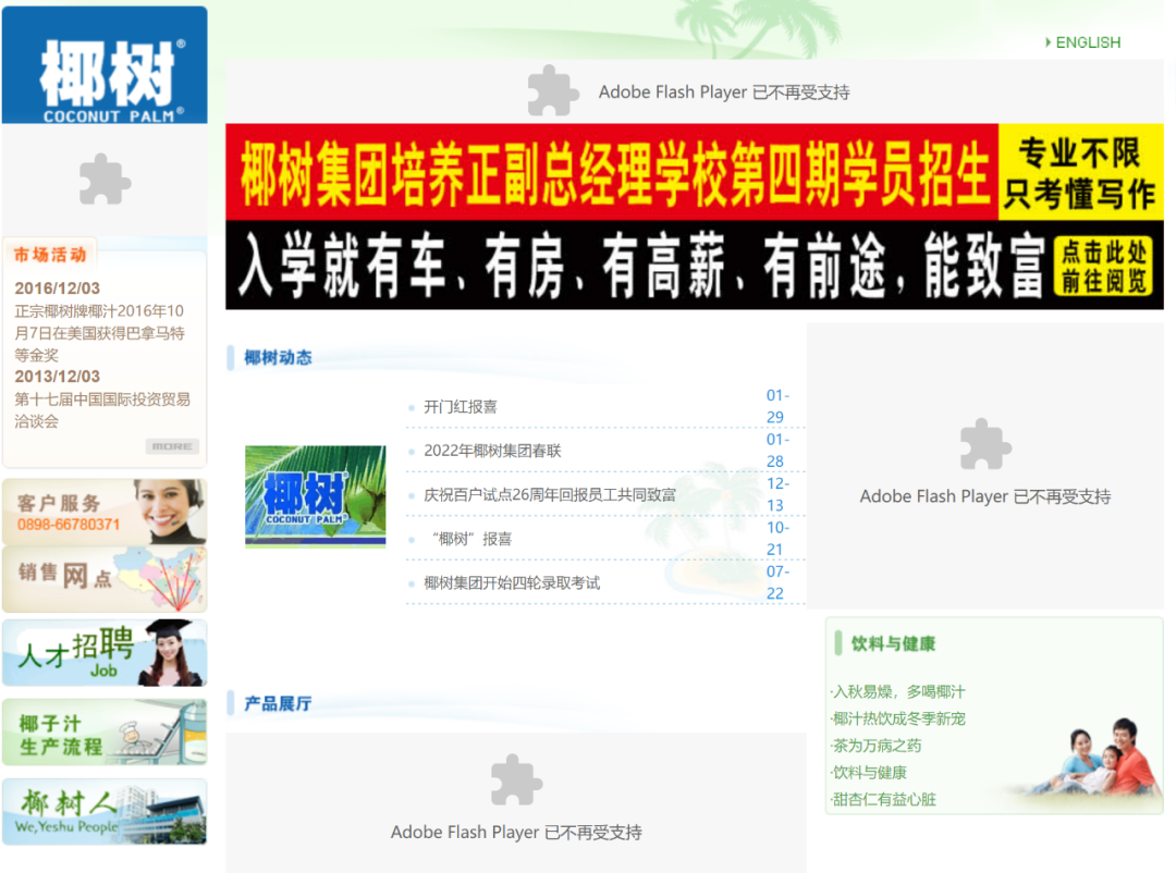椰树集团的官网页面,也很难看出时常更新的影子。除了椰树动态一栏还保留着今年年初发表的文章外,市场活动已经是2016年的旧闻,饮料与健康更是仅有2010年前的文章,包括产品展厅在内的多个板块都无法展示。最醒目的招聘标语点击后只是弹出一张完整的招聘海报图片,并不能跳转到更进一步的界面。