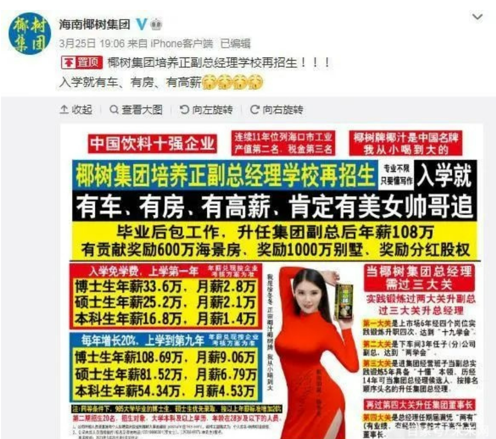 以2021年的招聘广告为例。去年3月,海南椰树集团在官方微博发布并置顶招聘海报称:“公司培养正副总经理学校招生,入学就有车、有房、有高薪,肯定有美女帅哥追。毕业后包工作,升任集团副总后年薪108万,有贡献奖励600万海景房,奖励1000万别墅。”