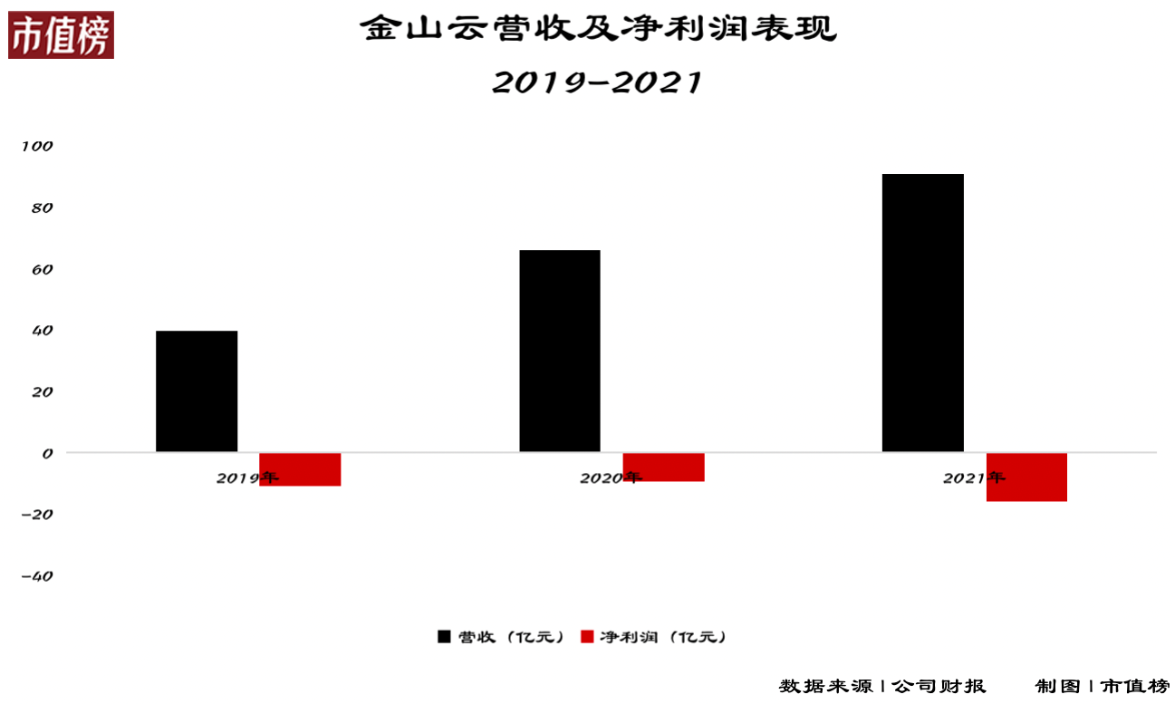 2019年至2021年,金山云的收入分别为39.56亿元、65.77亿元、90.61亿元,一直在增长。