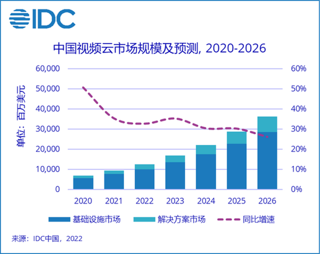 IDC预测,2021-2026年,中国视频云市场仍将保持快速增长,市场年均复合增长率预计达到31.0%,2026年将达到364亿美元(约合2600亿元)。研究咨询机构艾瑞咨询数据显示,截至2022年4月,中国Top100 APP中打在了点播、直播或实时音视频功能的比例高达69%。
