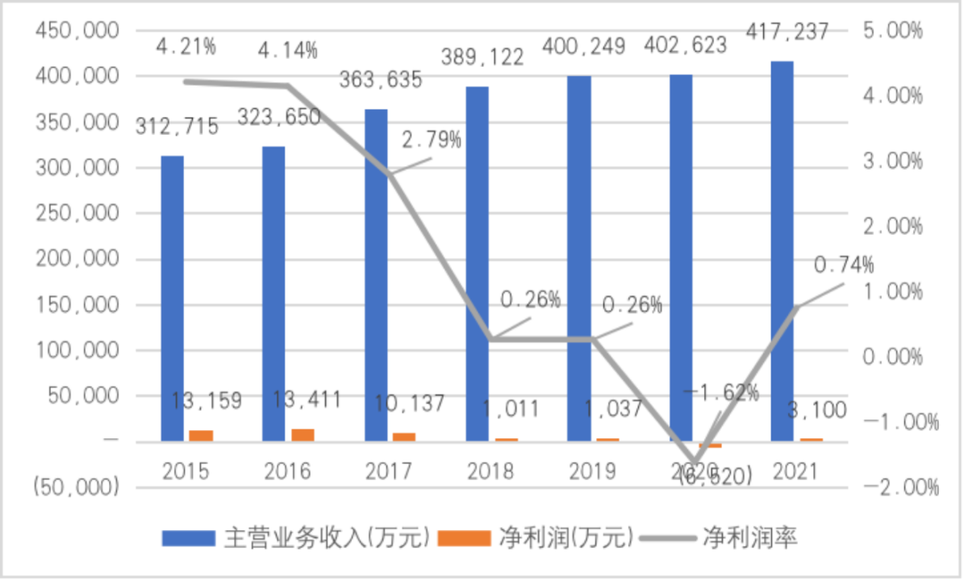 来伊份,作为“休闲零食第一股”,连续三年徘徊在40亿左右的营收,营收增长缓慢,2015年-2021年年复合增长率只有5%不到。整体盈利能力也令人担扰,过去4年净利润总计为-1372万元,在2021年勉强扭亏为盈,净利3100万元。