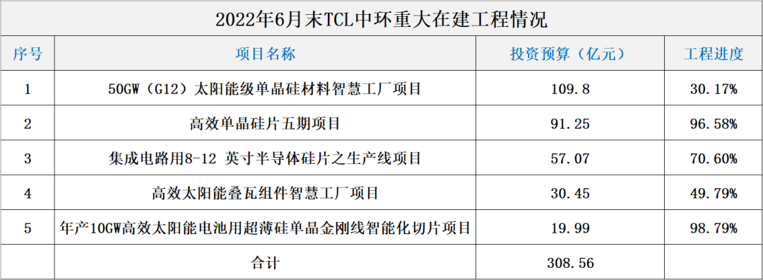 据黑鹰光伏统计,截至2022年6月末,TCL中环还有5个重大在建工程,总投资预算达308.56亿元,涵盖单晶硅片、叠瓦组件、半导体硅片等领域。