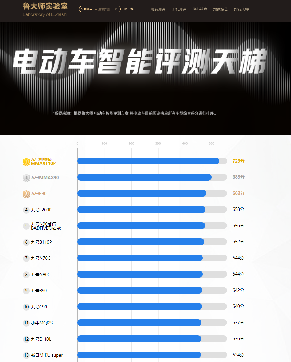 从鲁大师实验室评测结果可以看到,各家历史所有车型综合得分排名榜单上,前十名被九号公司的车型占据,见不到小牛产品的身影。