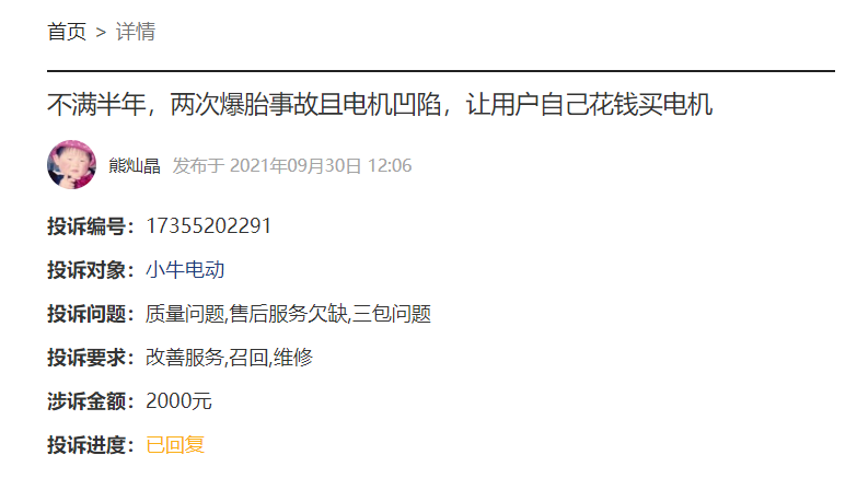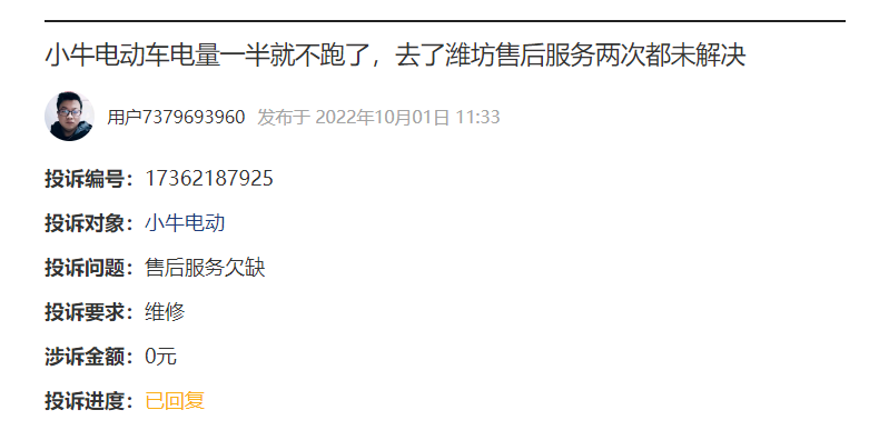 以黑猫投诉平台为例,针对小牛电动的投诉,主要集中在续航虚标、电池质量、电机质量等方面。