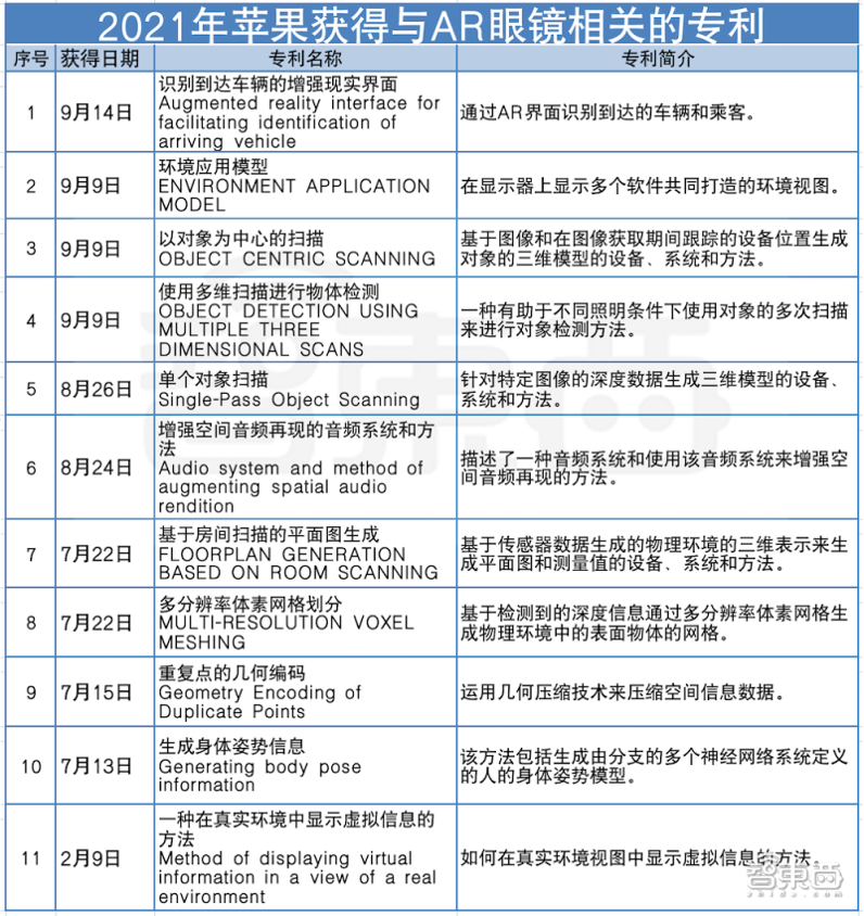 数据显示,仅仅在2021年前9个月,苹果与AR设备有关的专利技术就达到了11项,占了苹果在全年所拿下的专利技术的九分之一。