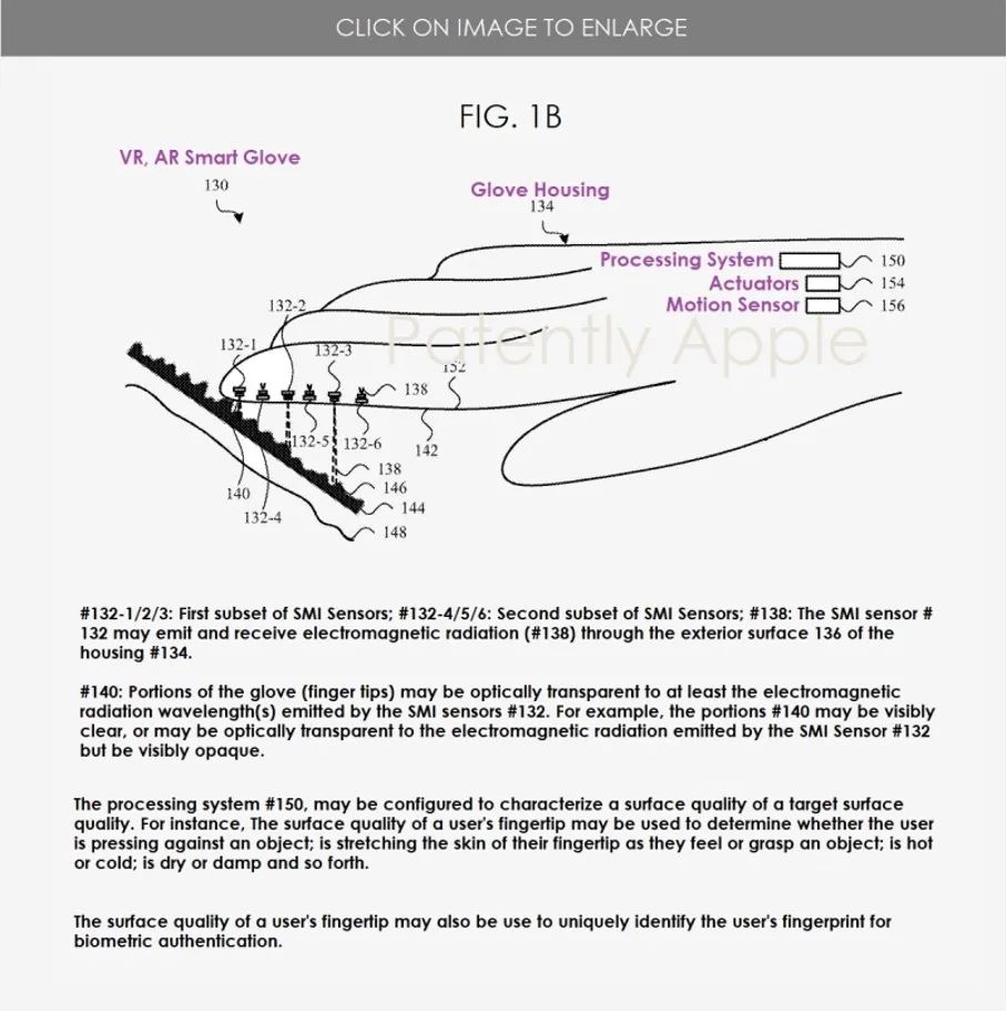 这项专利的编号为US11460293 B2,与此前曾报道的US20220099436 A1为同一家族的延续专利。专利中描述的AR/VR手套主打SMI表面压力传感,可渲染细微的体感变化,比如在AR/VR中模拟水下、隧道等场景的触感等等。除了手套形态外,该SMI方案还可以与Apple Pencil等设备结合,或是集成到智能戒指中。