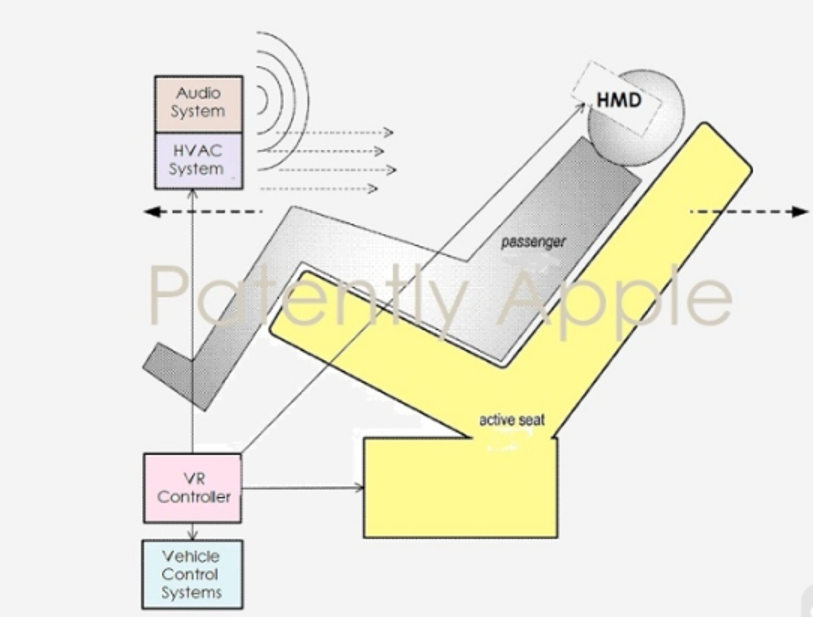这项专利的名称为“沉浸式显示器”。苹果对其描述为:一种用于车辆的VR系统,该系统可显示虚拟图像,并将视觉提示与车辆的物理运动匹配。