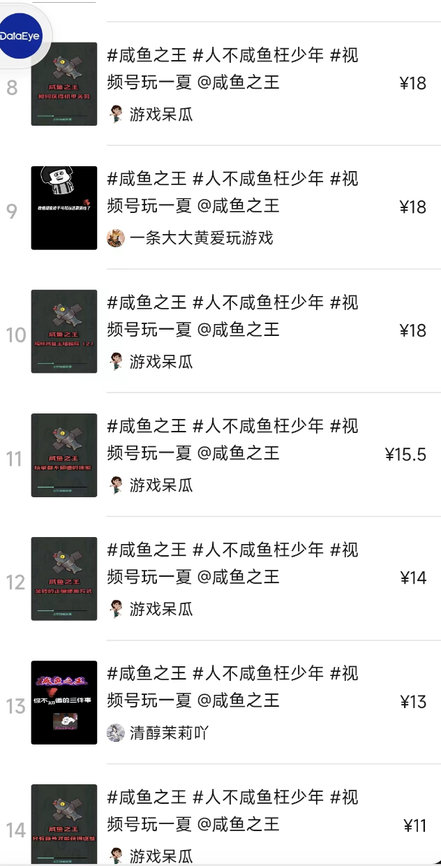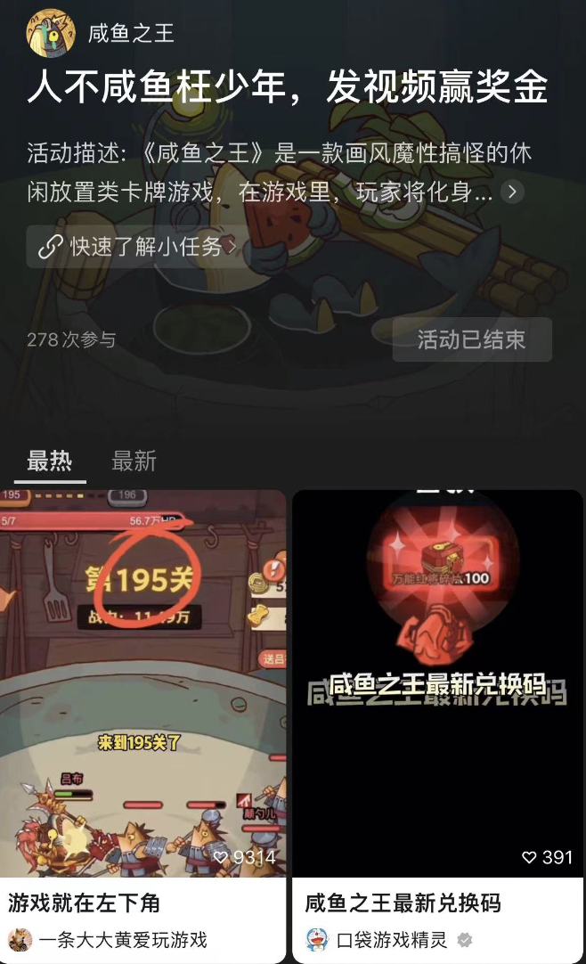 DataEye研究院发现,《咸鱼之王》曾在视频号上线“发视频赢奖金”活动,吸引达人创作出278组视频。