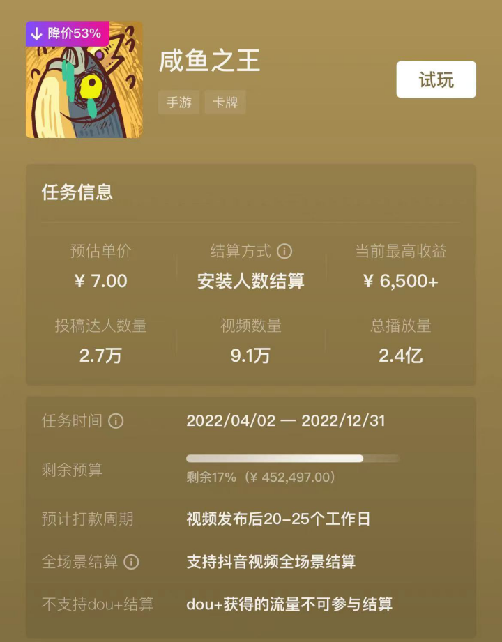 而据“抖音x星途发行人计划”显示,《咸鱼之王》于今年4月入局发行人计划,至今已经吸引超2.7万名达人创作出超9.1万组视频,总播放量目前已经达到2.4亿次。