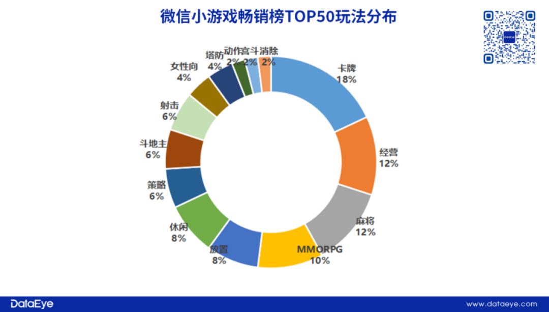 DataEyey研究院观察到,微信小游戏畅销榜TOP50玩法分布来看,卡牌品类营收占比能达到18%,位居榜首。