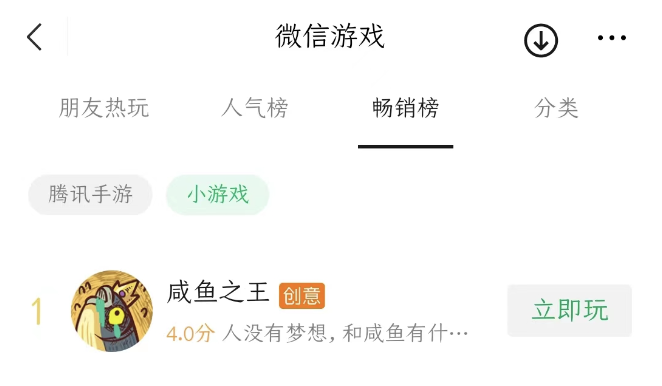 大量的素材投放,也让《咸鱼之王》长期占据微信小游戏畅销榜前列的位置。