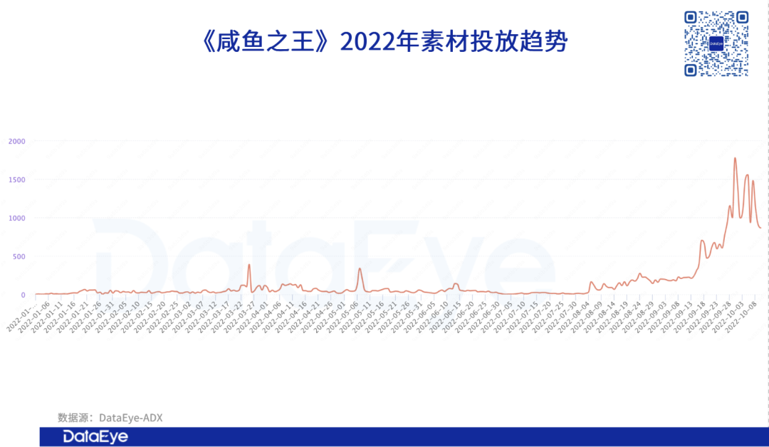 具体到单个产品的投放趋势来看,《咸鱼之王》小游戏版本在今年8月前投放量并不出众,仅仅是以少量维系产品热度。然而,从8月份起,《咸鱼之王》小游戏版本的素材投放量逐步上升,并且在9月14日当天迎来小高峰,后续仍在持续增长。