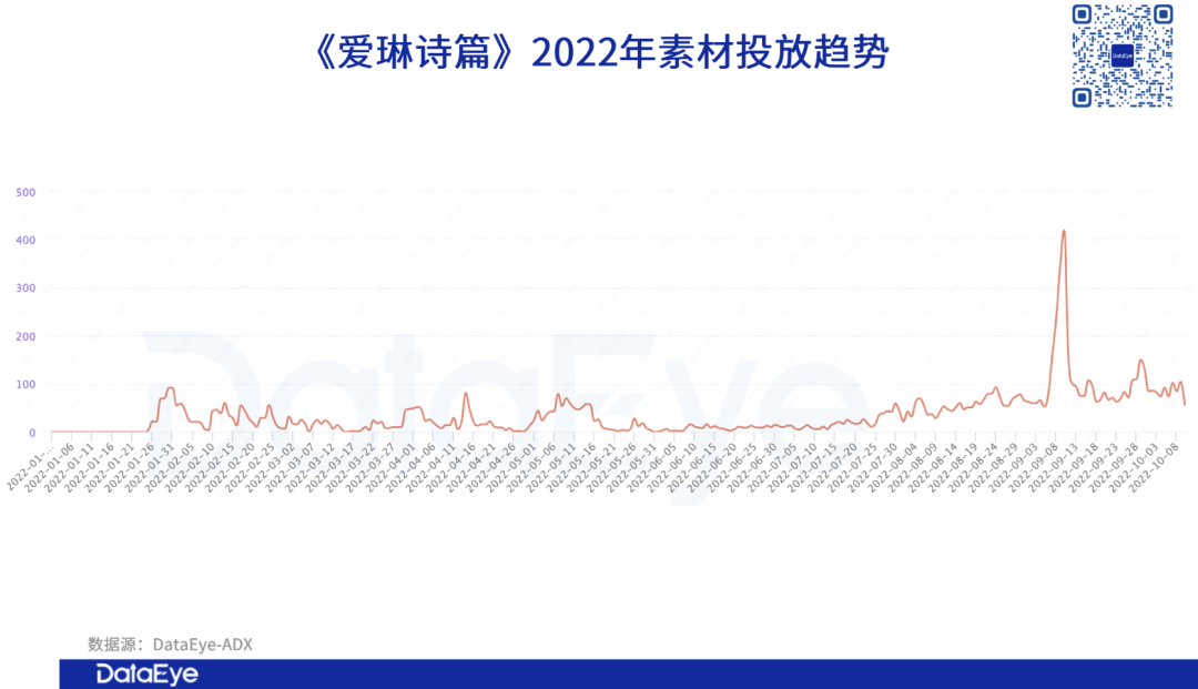 《爱琳诗篇》也同样自今年7月初开始,加大了素材投放量级,并在9月初迎来单日投放量巅峰。
