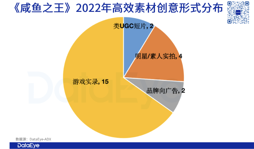在创意形式上,游戏画面实录是《咸鱼之王》最常用的创意形式,其次,《咸鱼之王》也会用真人素材进行创意包装。