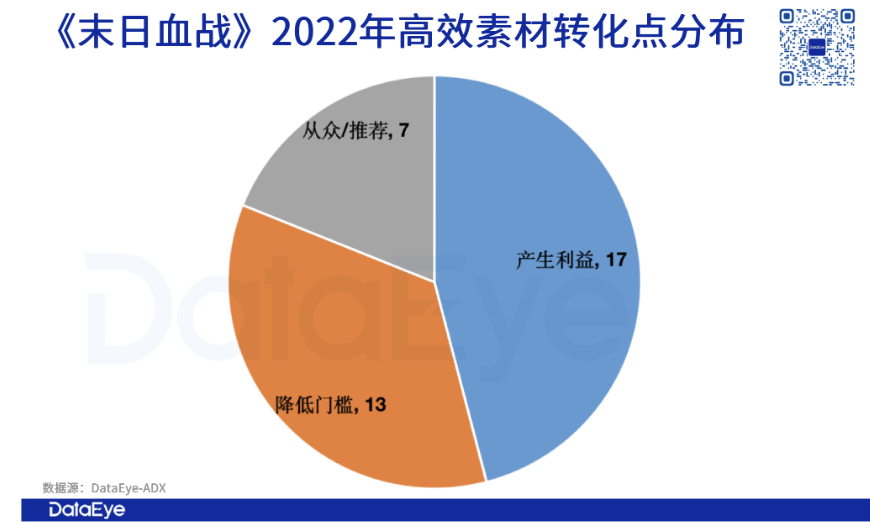 在转化点上,《末日血战》TOP20的高效素材是以“好奇尝试”、“产生利益”为主要切入点。具体而言,《末日血战》会更多直接展示游戏实录画面,期望用美式风格的角色素材去达到吸引玩家游玩的目的。