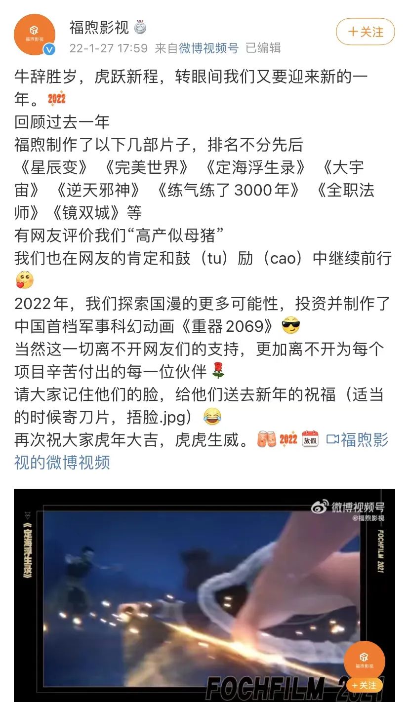 福煦影视参与制作《太平天书之将魂觉醒》《天道图书馆》《剑灵同居日记》《我捡起了一地属性》《从红月开始》《全职法师6》《星辰变5》《完美世界》等8部作品,《全职法师6》《星辰变5》《完美世界》均是续作,《完美世界》还是年番。