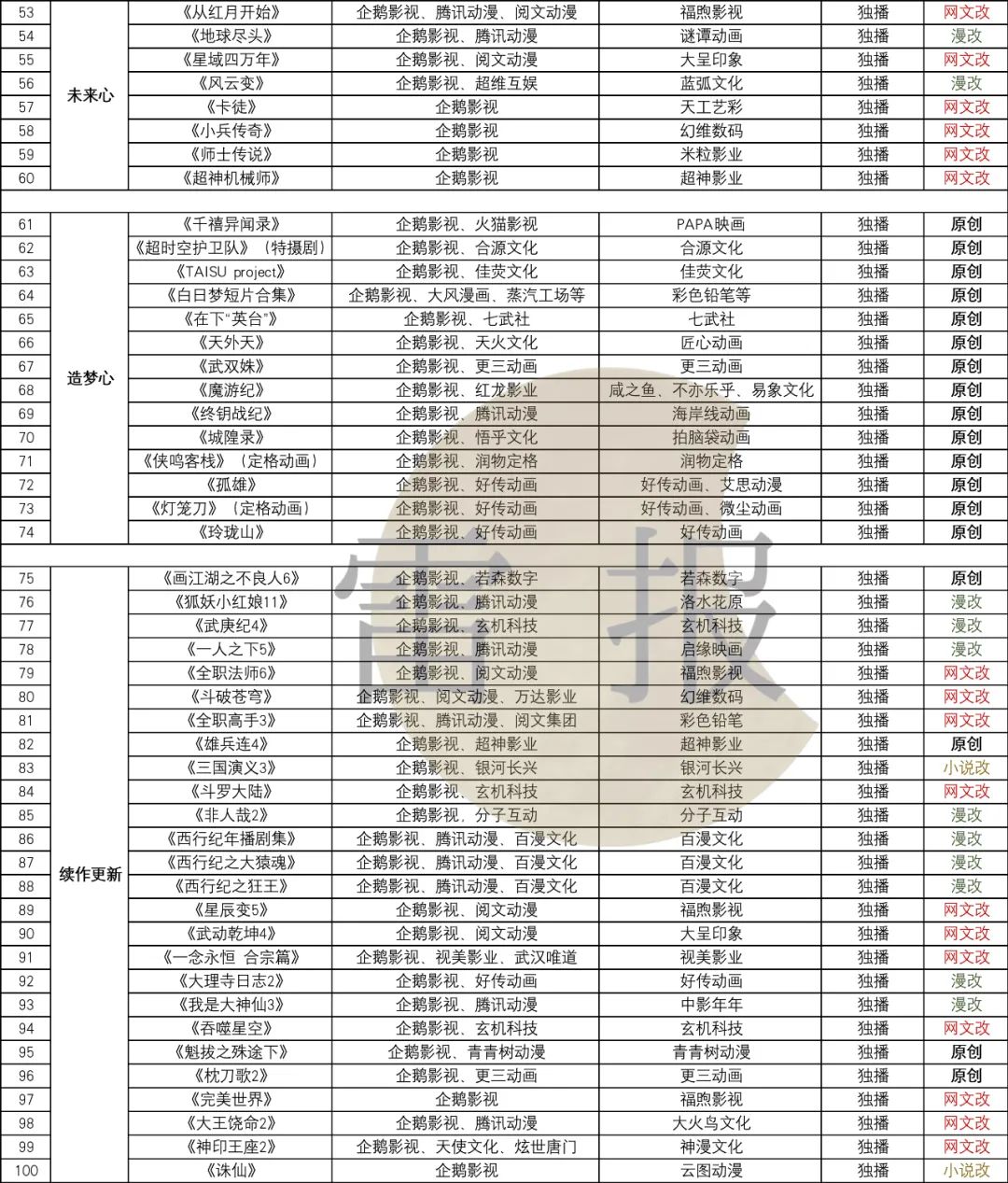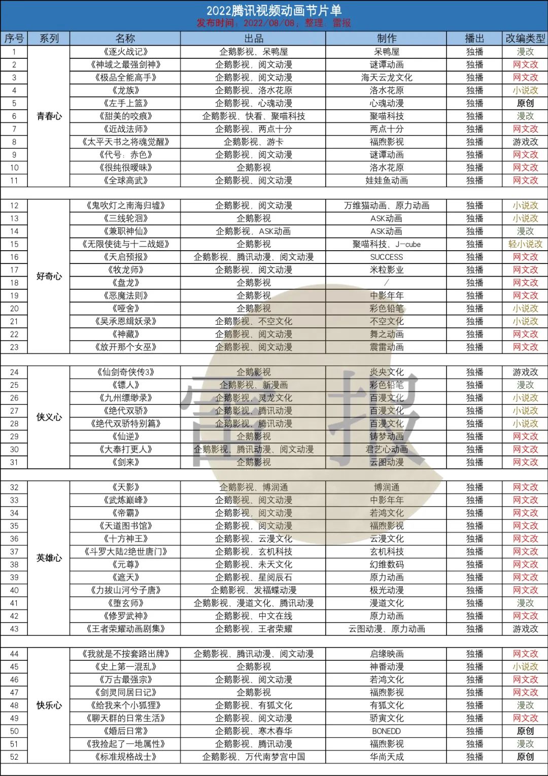 先来看腾讯,这是其8月8日发布的100部动漫作品的详细情况。
