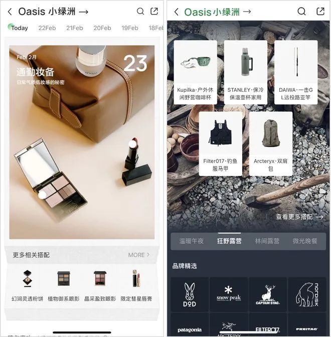 这种主题式电商思路,成为小红书中心化运营主要路径。今年6月,小红书上线自营电商项目“小绿洲”,主打露营、骑行、露亚、滑雪、冲浪等户外产品,且多为小众品牌,由新社区部的自营团队负责,与福利社平行运行。