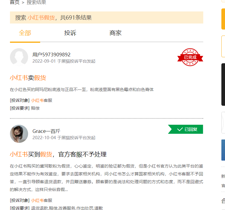 另外,在电诉宝平台官方2022年第一季度统计中,小红书的投诉量也排在所有电商平台第二位——这些投诉涉及货不对板、疑似售假、虚假促销、售后欠缺等问题。