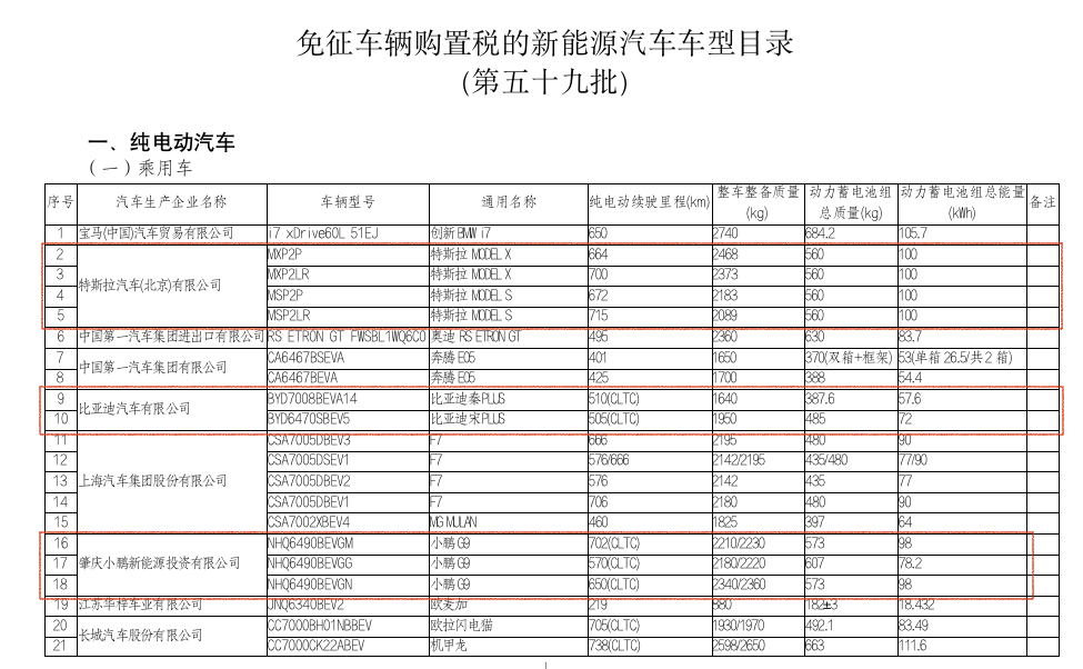 10月10日,工信部网站公告《免征车辆购置税的新能源汽车车型目录》(第五十九批),特斯拉、比亚迪、小鹏汽车部分车型在列。