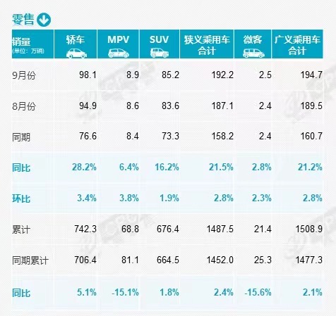 今年1至9月乘用车市场总零售量达到了1487.5万辆,同比增长2.4%,同比净增35.5万辆。其中,其中6至9月增量贡献巨大,同比净增143万辆。