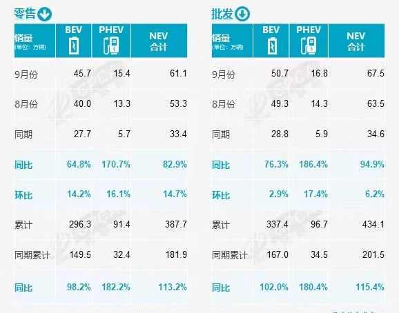 9月新能源市场增长依旧强劲,新能源乘用车批发销量与零售量分别为67.5万辆与61.1万辆,分别同比增长94.9%与82.9%。其中,9月纯电动批发销量50.7万辆,同比增长76.3%,插电混动销量16.8万辆,同比增长186.4%。