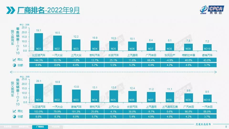 厂商层面,9月各品牌乘用车零售销量排行榜前三名依旧由比亚迪、一汽大众与上汽大众占据,销量分别为19.1、16.5与12.2万辆,分别占据了9.9%、8.6%与6.4%的市场份额。