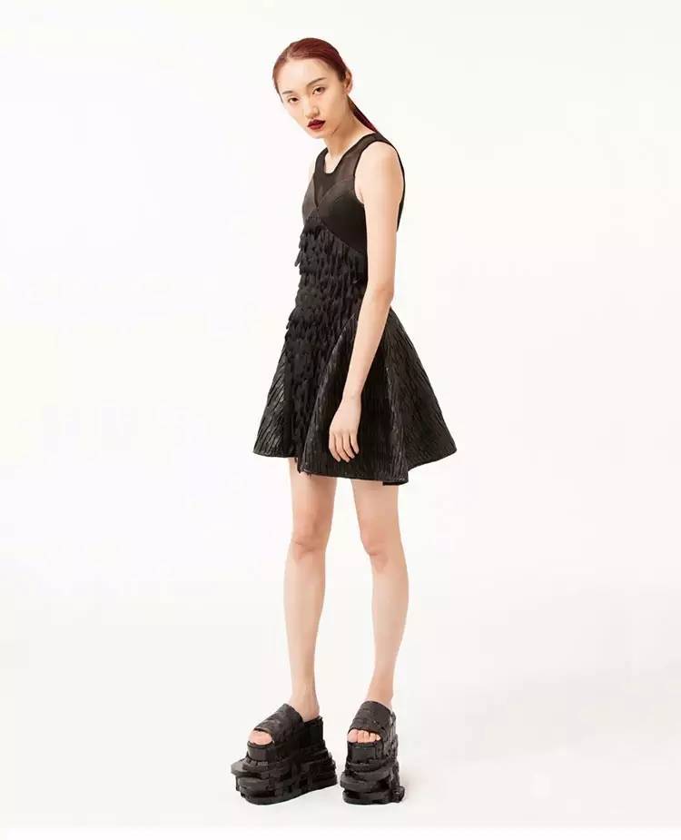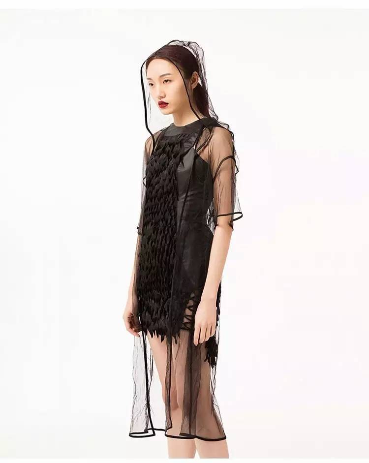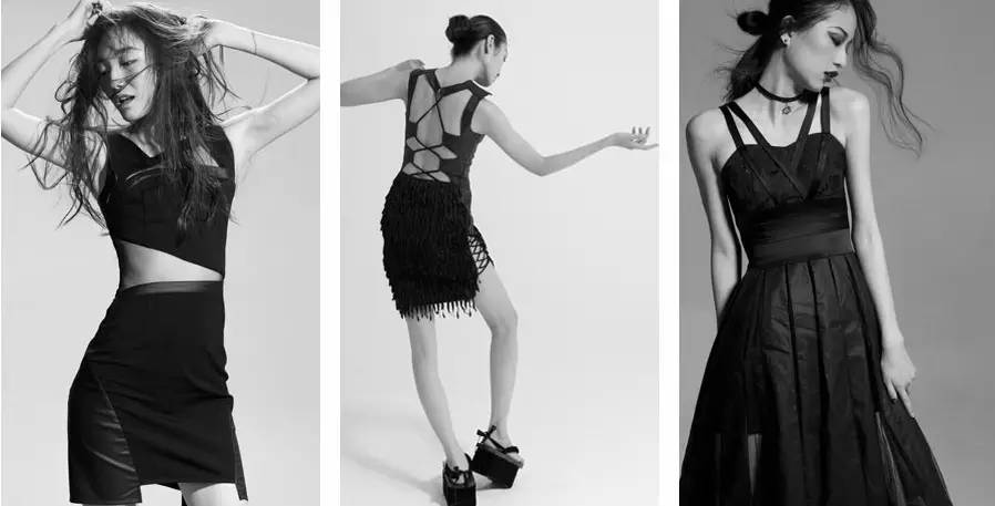 非洲之旅系列以黑色为主色,运用不同质感的面料剪裁出线与面的有趣碰撞,露、透之间营造出丰富的视觉空间,服装充满画面感和层次感。
