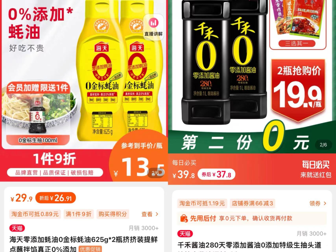 现在,海天、厨邦、加加、李锦记等酱油品牌线上旗舰店中,零添加、减盐、薄盐等主打健康牌的产品均被放到了首页海报位置。各大品牌最初挂着的国庆节礼包也都暗暗加上了“零添加”等字眼。并且,零添加的产品售价要高于有各类添加剂的产品。